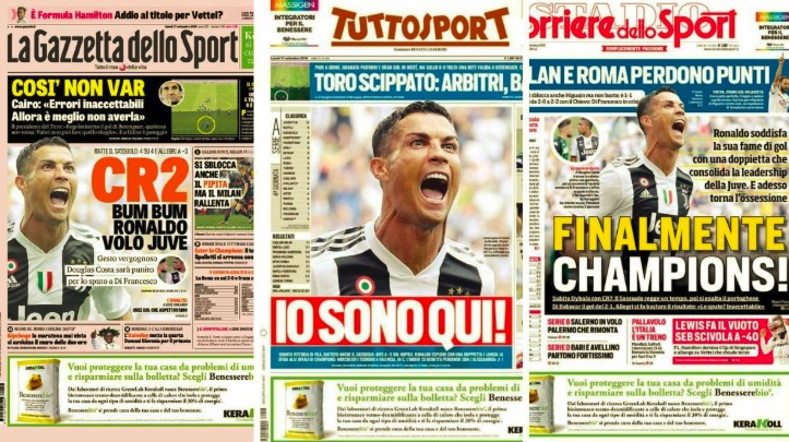 优博9月17日讯 在C罗打进意甲处子球并梅开二度后,意大利媒体对其大加赞赏。《罗马体育报》、《都灵体…