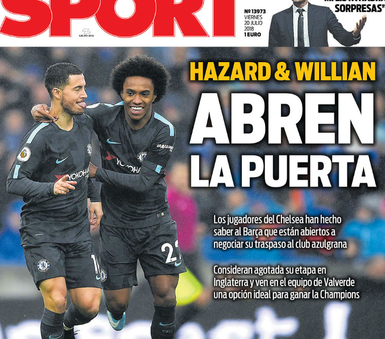 优博7月20日讯 在今天出版的《每日体育报》头版上,威廉和阿扎尔成为了主角,这两名巴萨今夏…