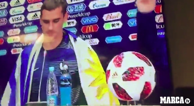 优博7月16日讯 夺得世界杯冠军后,格列兹曼在新闻发布会上披上了一面乌拉圭记者给他的乌拉圭…