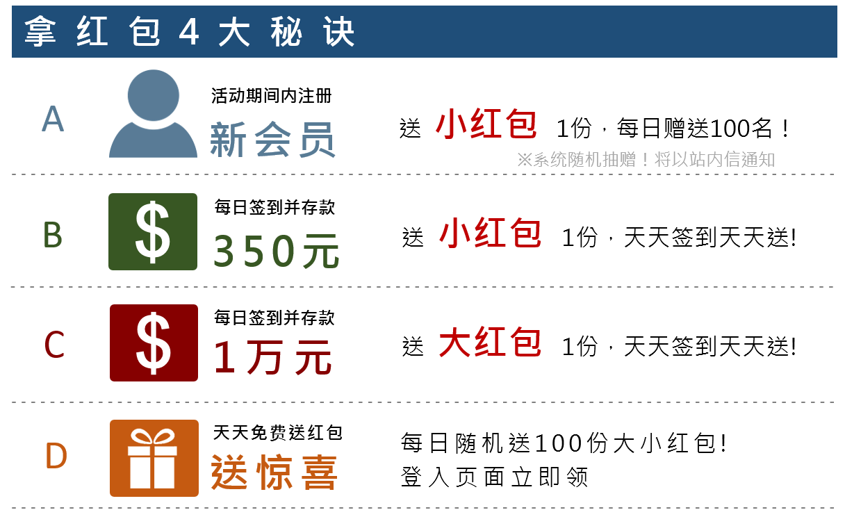 天降红包雨,选出你的幸运红包,夺得最高8,888元! 《 活 动 时 间 》北京时间06月14日中午00时至08月03日晚上24时 ※ 新会员小红包将由系统随机抽赠,于注册24小时内皆享有中奖资格!中奖将以优博站内信通知。 ※ 详细活动规则请参照世界杯活动页面