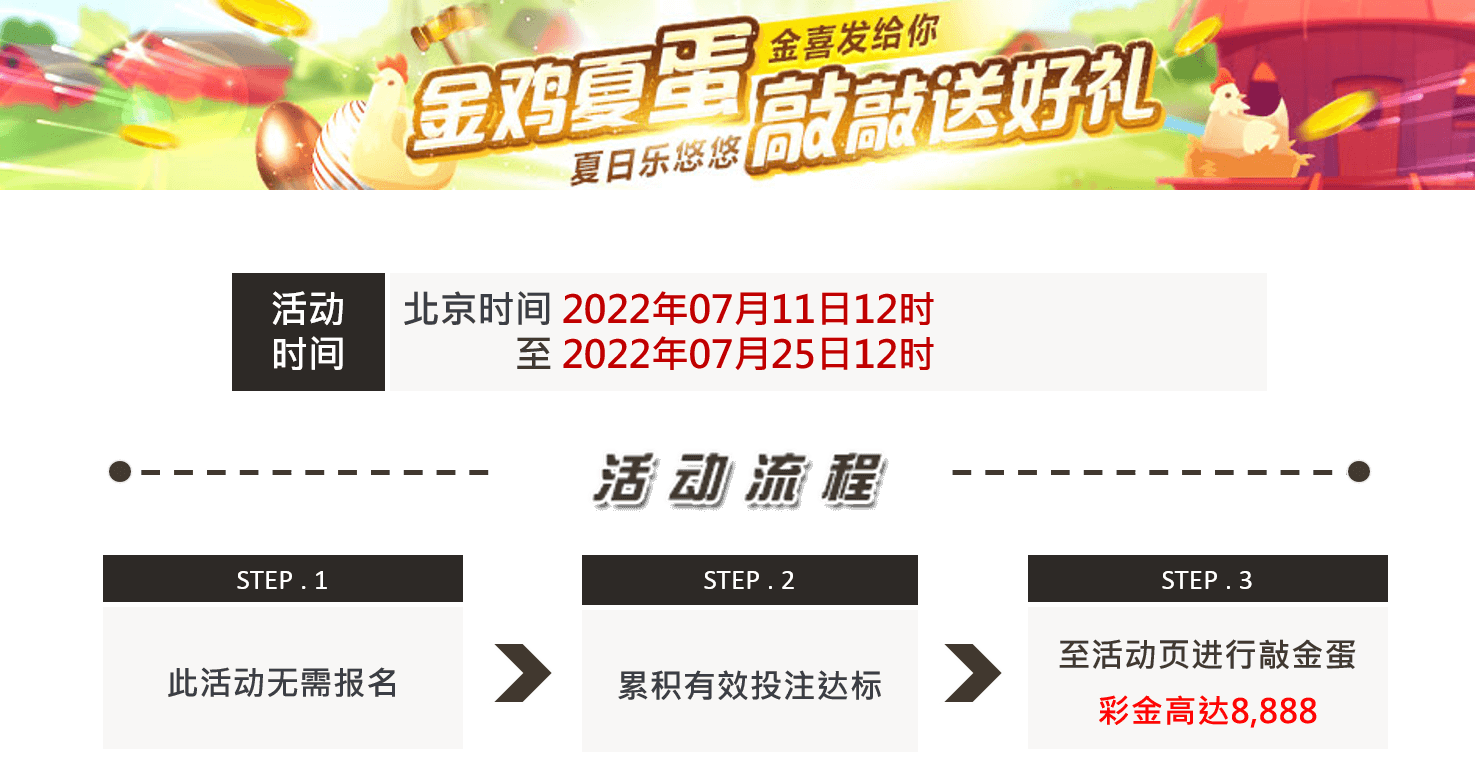 《 活 动 内 容 》 活动期间内累积有效投注1元可获1点,累积50,000点即可敲金蛋抽取金蛋彩