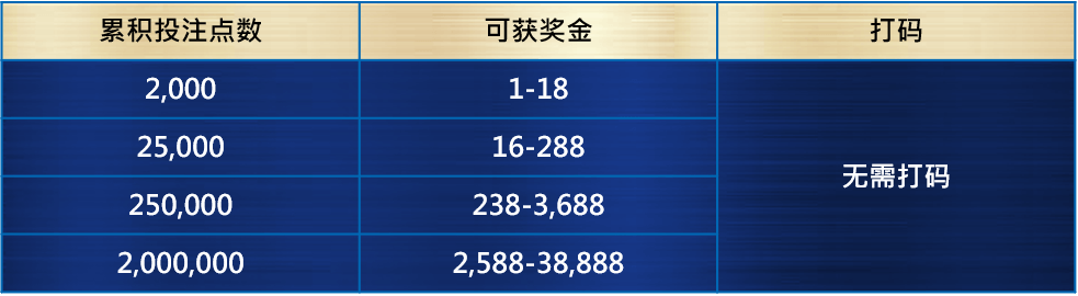 活 动 内 容 :活动期间内累积有效投注1元可获1点,累积2,000点即可进行开奖