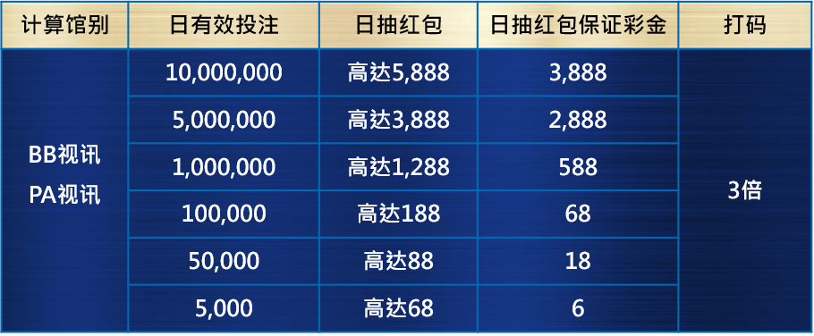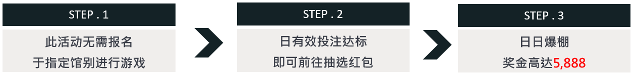《 活 动 内 容 》 活动期间内每日于指定馆别满足日有效投注达标,就能抽红包!保证奖金在手,更有机会赢取最高5,888!