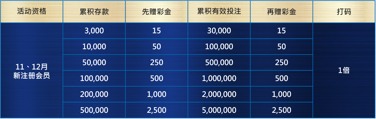 3. 存款及投注计算区间:11月注册会员为美东时间2025-11-01至2025-12-31,12月注册会员为美东时间2025-12-01至2026-01-31