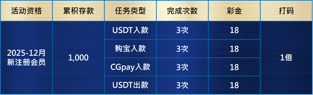 2. 仅限定出入款方式:USDT、购宝、CGpay可参与此活动之任务类型次数计算