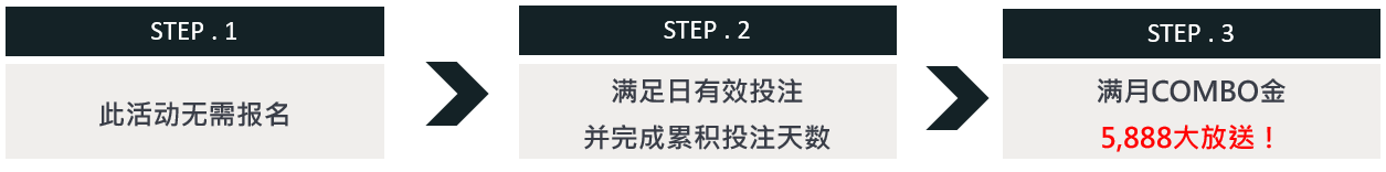 活 动 内 容 : 活动期间内,日有效投注2,000起,并满足指定累积投注天数,即可获得满月COMBO彩金!