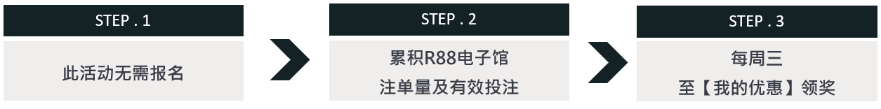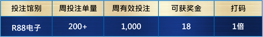 活 动 说 明 : 活动期间内,于R88电子满足周投注单量及周有效投注,即可获得彩金