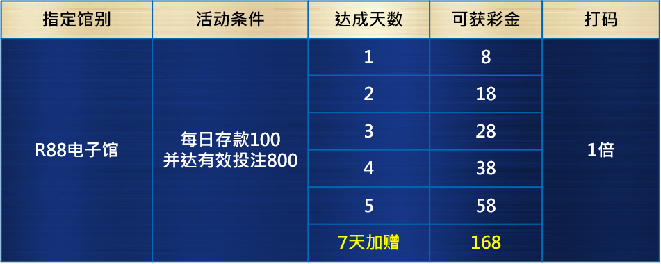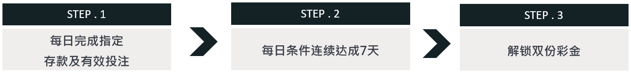 活 动 说 明 : 活动期间内,完成指定活动条件,依照达标天数,可获得相对应彩金!连续7天皆达成,彩金再加赠送!