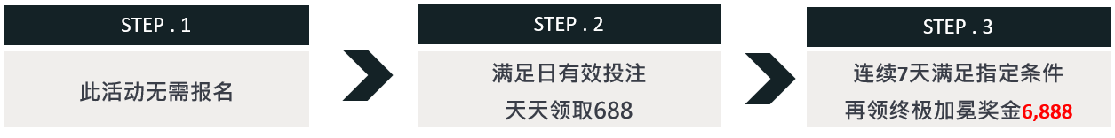 活 动 内 容 : 活动期间满足日有效投注15,000起即可获得黄金冲刺奖,最高天天领取688!连续七天满足指定有效投注,再享终极加冕奖6,888!
