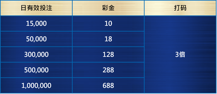 黄 金 冲 刺 奖 :活动期间每日有效投注达1.5万即可获奖,天天最高领688!