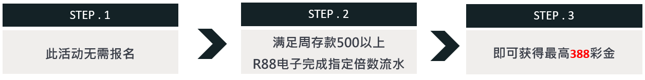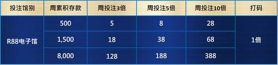 2. 会员周存款9,000,R88电子有效投注达80,000,即满足周存款8,000的10倍,可获得388元彩金