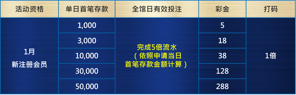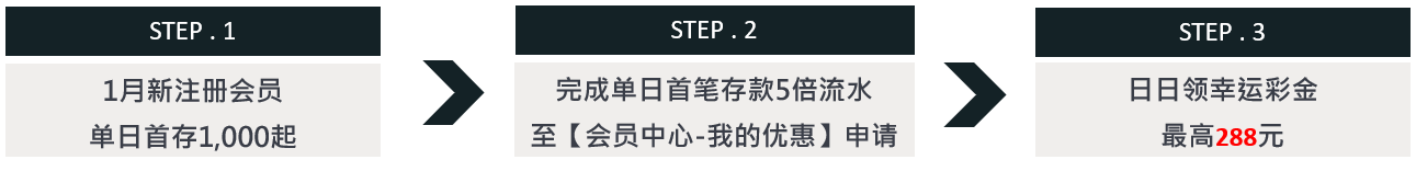 活 动 内 容 : 1月新注册会员单日首笔存款1,000以上,并完成实际存款金额5倍流水,即可前往【会员中心-我的优惠】申请,活动期间内每日皆可申请1笔,快来挑战日日最高领取288元!