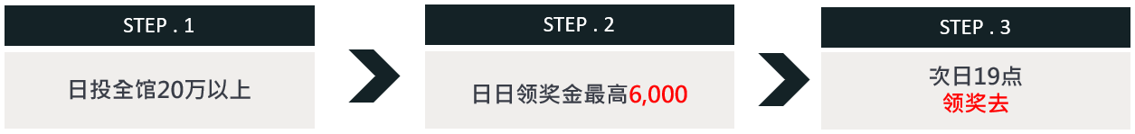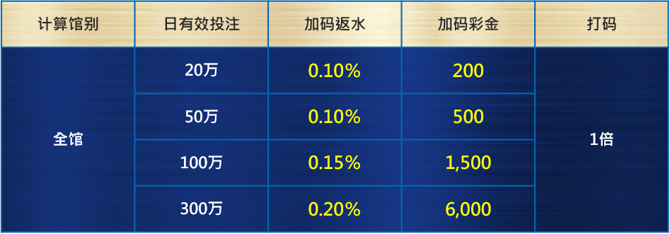 《 活 动 说 明 》当日全馆累积有效投注20万以上,隔日即可享返水加码优惠!