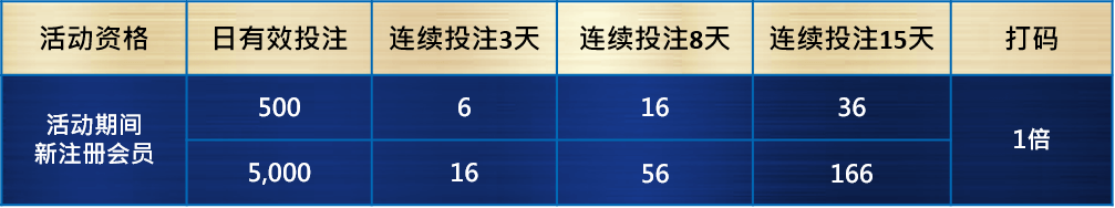活 动 内 容 : 新注册会员于活动期间内至【会员中心-我的优惠】申请,满足日有效投注500及指定连续投注天数,最高领取166奖励!