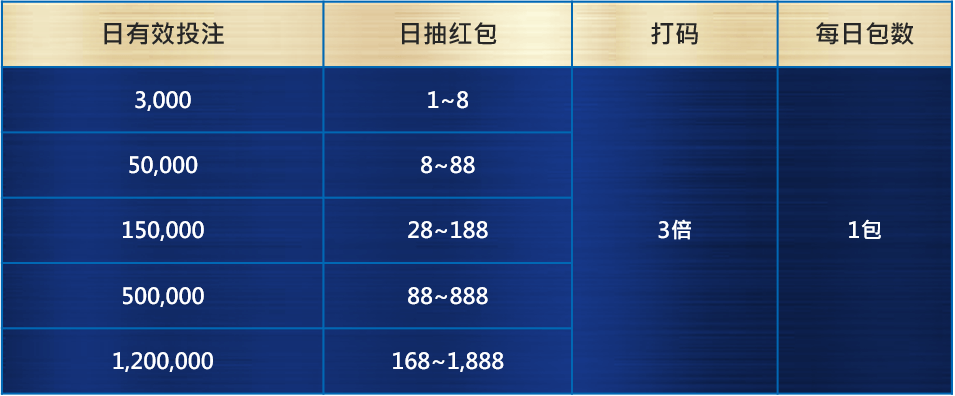 例1:若您当日满足日有效投注3千即去抽选红包,则若日有效投注再达5万,将无法抽选红包