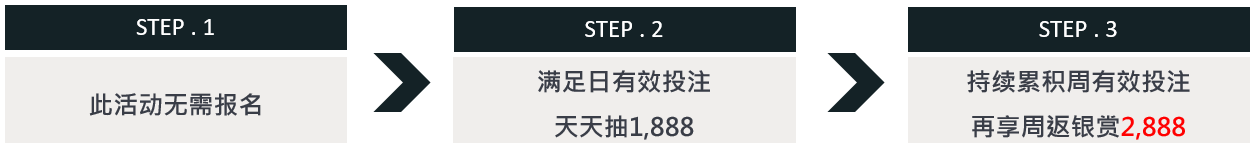活 动 内 容 : 活动期间满足日有效投注3,000起即可前往抽红包,最高1,888日返银赏,持续累积周有效投注,再享周返银赏最高2,888!