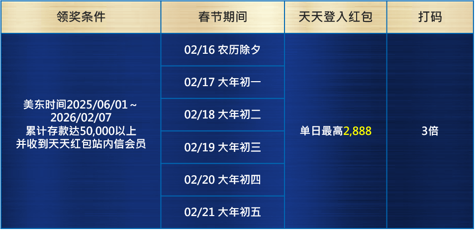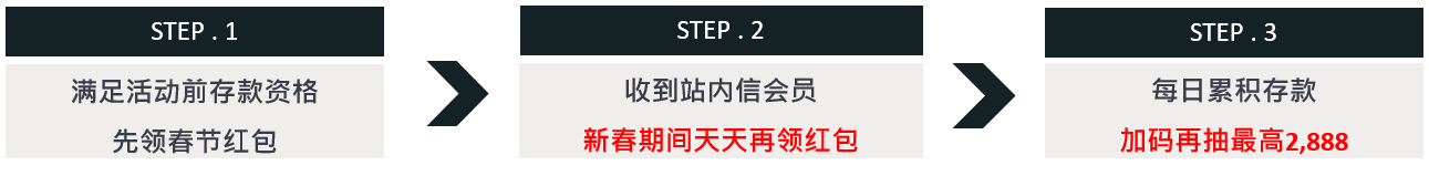 活 动 内 容 : 活动无需报名,符合指定领奖条件,即可至【会员中心-我的优惠】领取红包。期间达标日存款,天天再抽最高2,888加码红包!