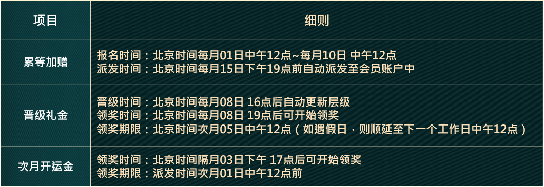 1. 本月符合月有效投注及单周存款条件,无需进行申请,系统将自动计算等级升级