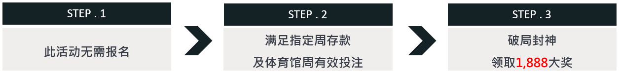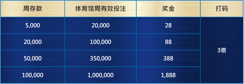 活 动 说 明 : 活动期间内累积指定周存款及体育馆周有效投注,即可依达成门槛领取对应奖金,