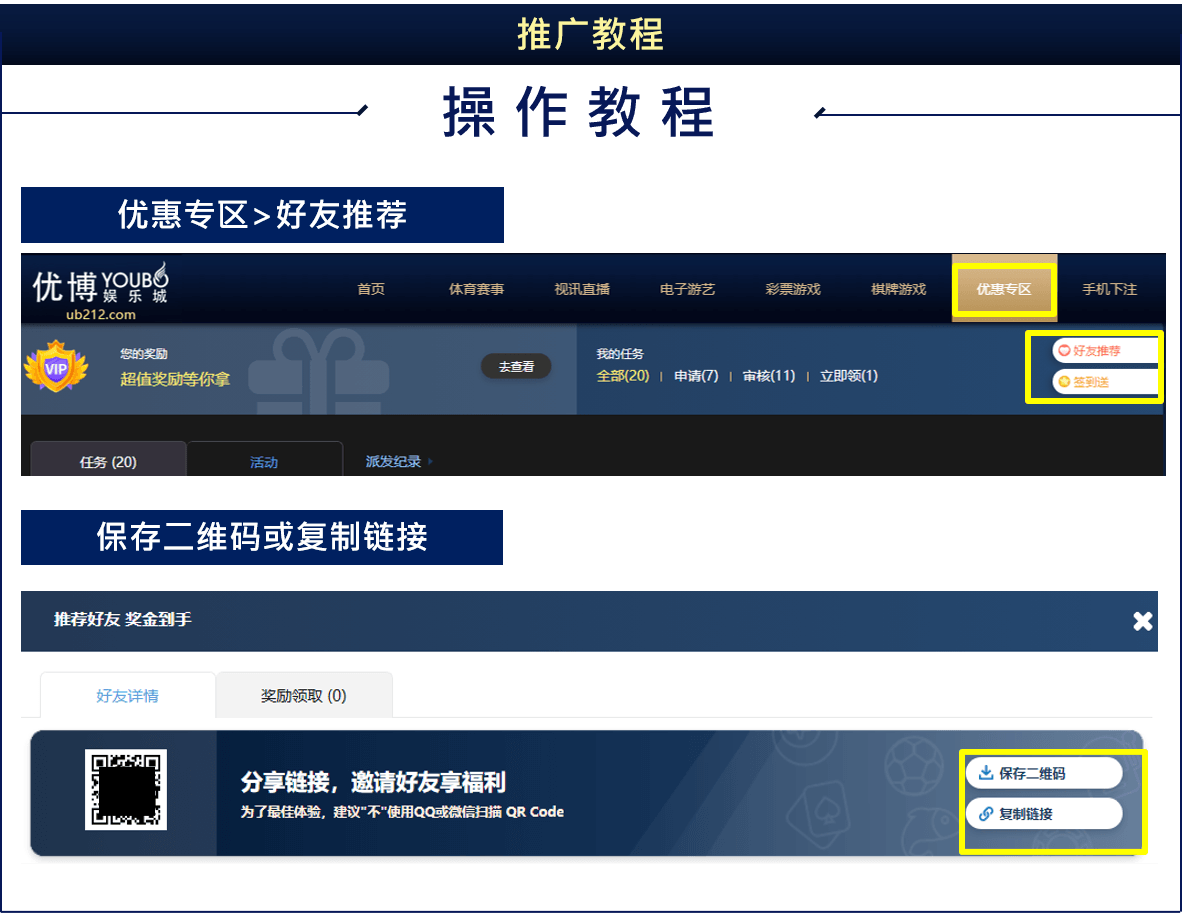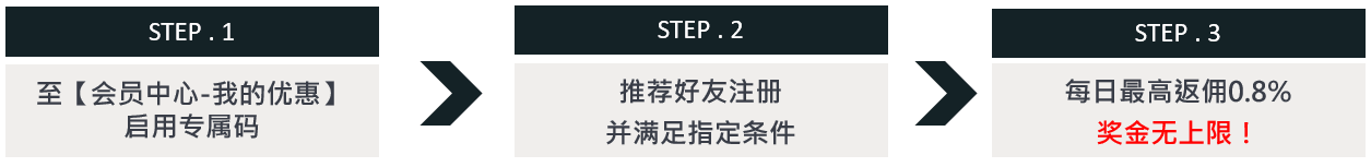 参 加 方 式 : 至【我的优惠】点击【好友推荐】,启用【专属二维码】和【专属链接】,即可邀请您的好友使用该连结报名,抖音,朋友圈,微信,微博,论坛,QQ群都是您的宣传收益渠道!